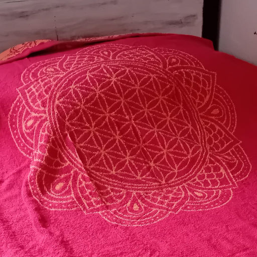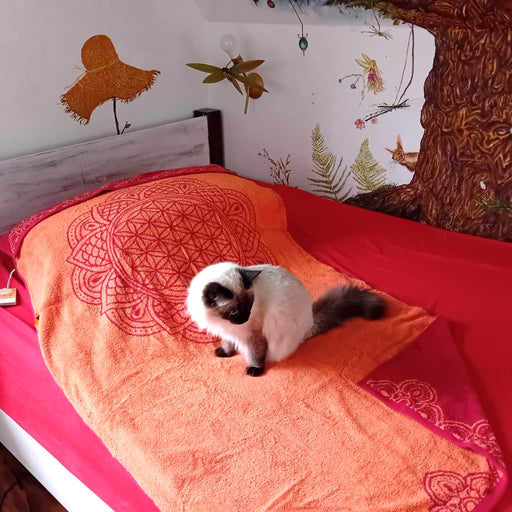 Saunaliegetuch aus Biobaumwolle mit eingearbeiteten Edelsteinen Dieses kuschelige Handtuch ist etwas ganz Besonderes. Zweifarbig in rot oder orange...